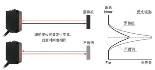 TOF方式是根據(jù)時(shí)間差來測(cè)量距離的,所以不受工件顏色、材質(zhì)的影響。因此、更換工件時(shí)無(wú)需任何調(diào)整便可穩(wěn)定感應(yīng)。